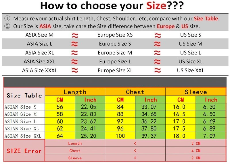 S / M / L /XL / 2XL How to Choose Your Size??? 1: Measure your actual T shirt Length, Chest, Shoulder… etc, compare with our size table. 2: Our size is Asian size what are very samller (about 2 size difference) than Europe & US size. If you are no sure about the size, please contact us, Thank you! |