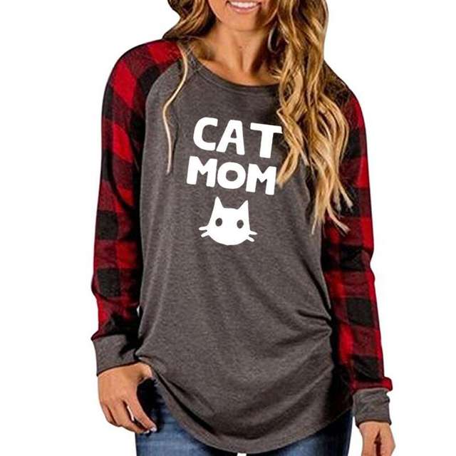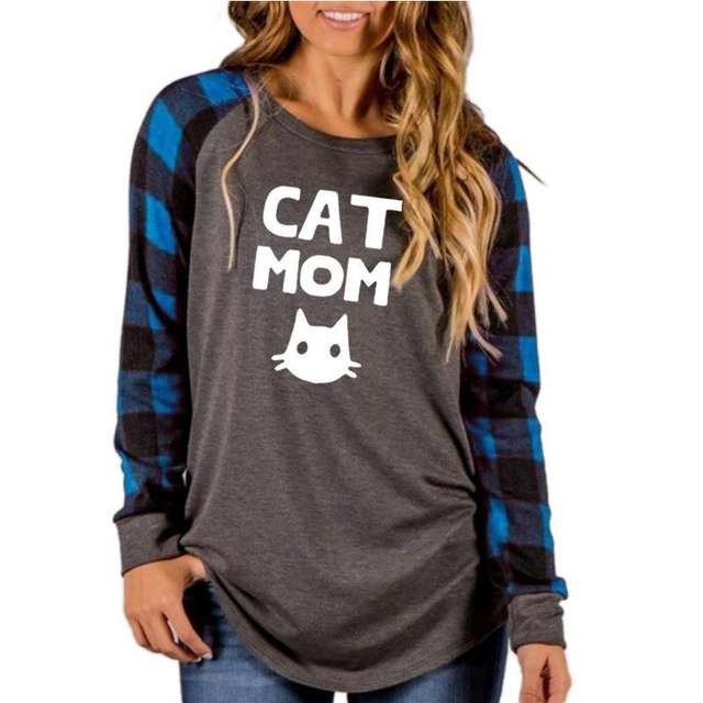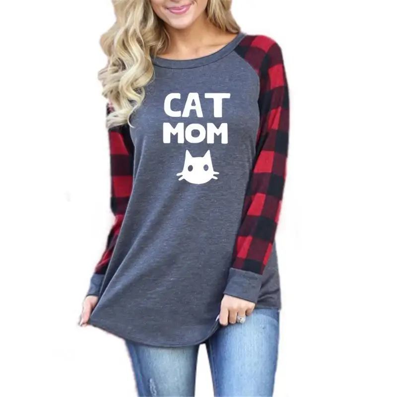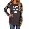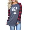 2019 Fashion Cat Mom Letters Print Plaid Stitching Long Sleeves T-Shirt for Women Plus Size Tops Women Streetwear Mother’s Day