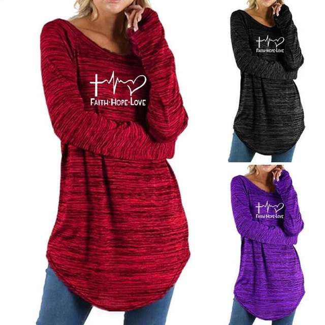 2019 Fashion Round Neck Irregular Long Sleeve Faith Hope Love Geometric Print T-Shirt for Women Plus Size Harajuku Tops Summer