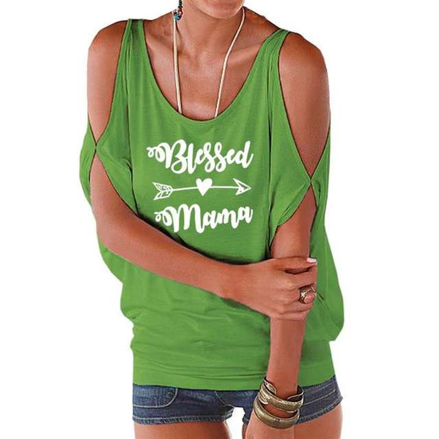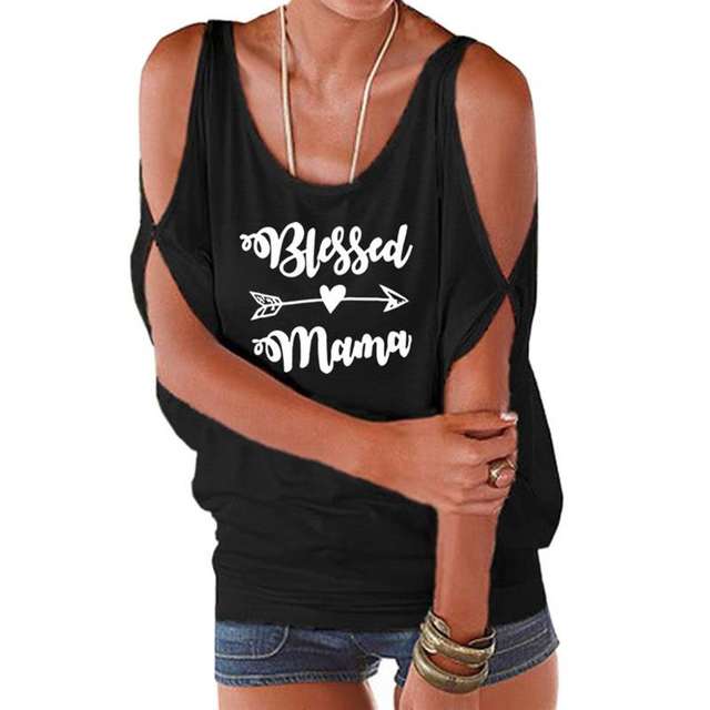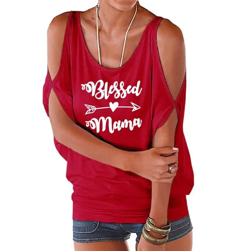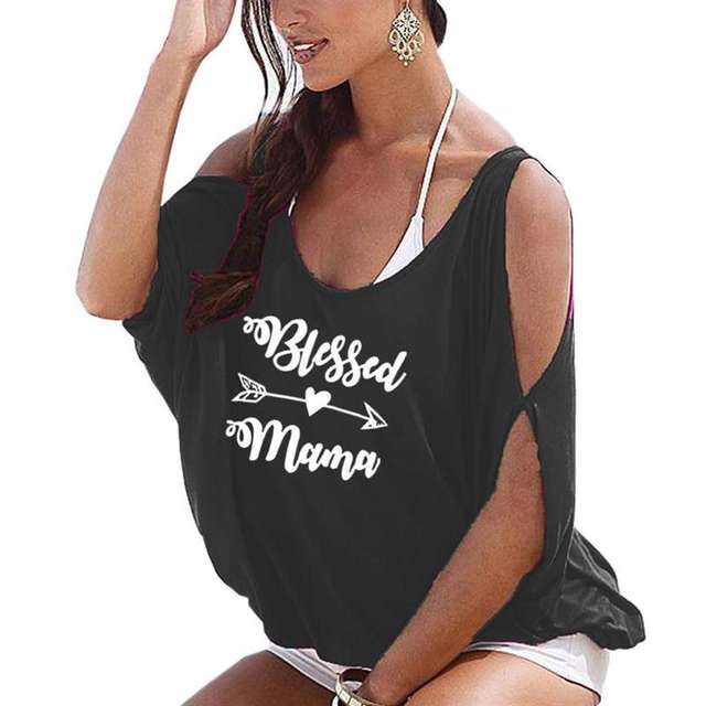 2019 New Fashion Off The Shoulder Bat Sleeve T-Shirt For Women Blessed Mama Letters Print Tshirt Harajuku Top Women Cotton Tops