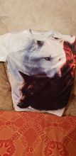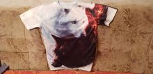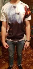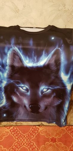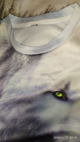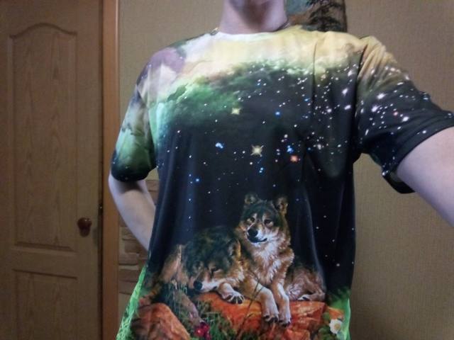 Normal T-shirt, synthetics, but very nice on the body, there are small jambs, the collar is shifted, and so, the print is worse than in the photo from the store, for this price is quite adequate!