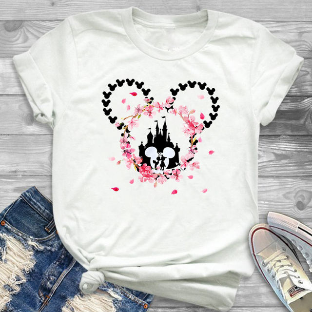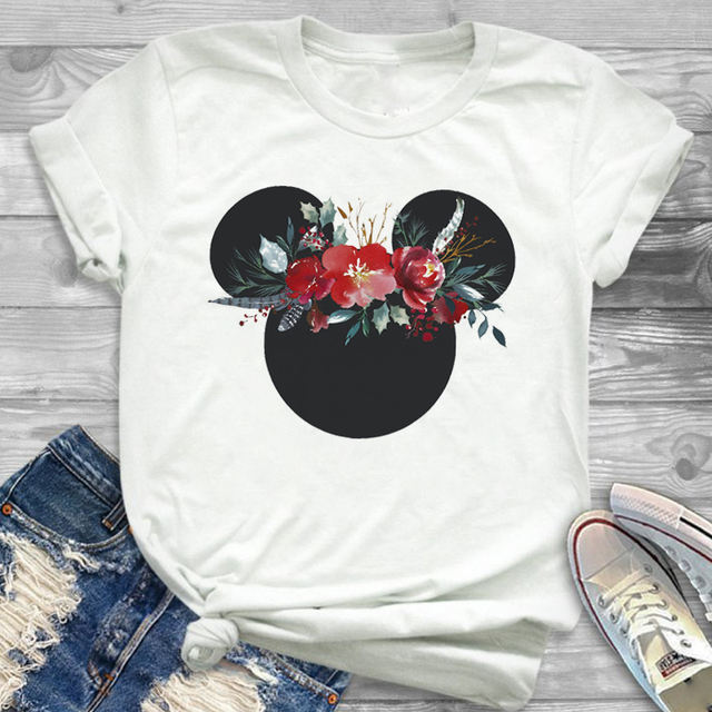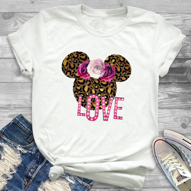 2019 Women Leopard Printed Graphic Flower Fashion T-Shirt Mouse Micky Ear Shirt Tumblr Tee Hipster Female T Shirt Tees
