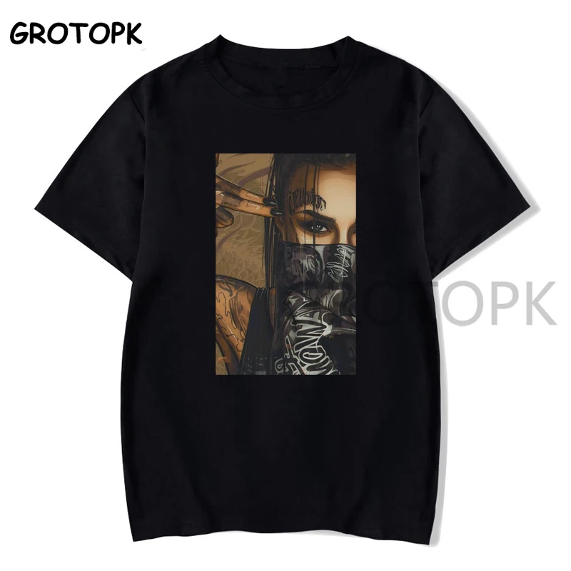 Cool Masked Lady Grunge Streetwear 100% Cotton Hip Hop Black T-shirts for Women Plus Size Harajuku Punk Tops Female 90s Fashion