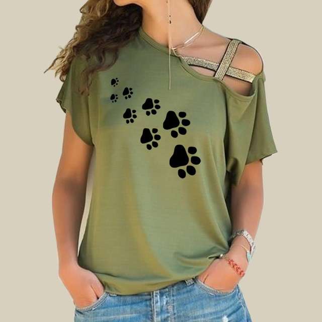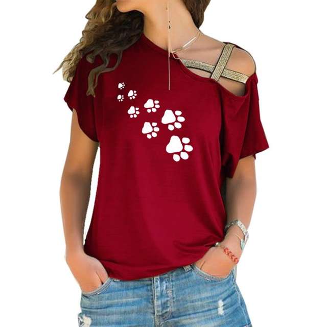 Dog Cat Paw Heart 2018 T-shirt Women Fashion Plus Size Tshirt Tops Punk Harajuku Cross-shoulder Irregular Short-sleeved T-shirt