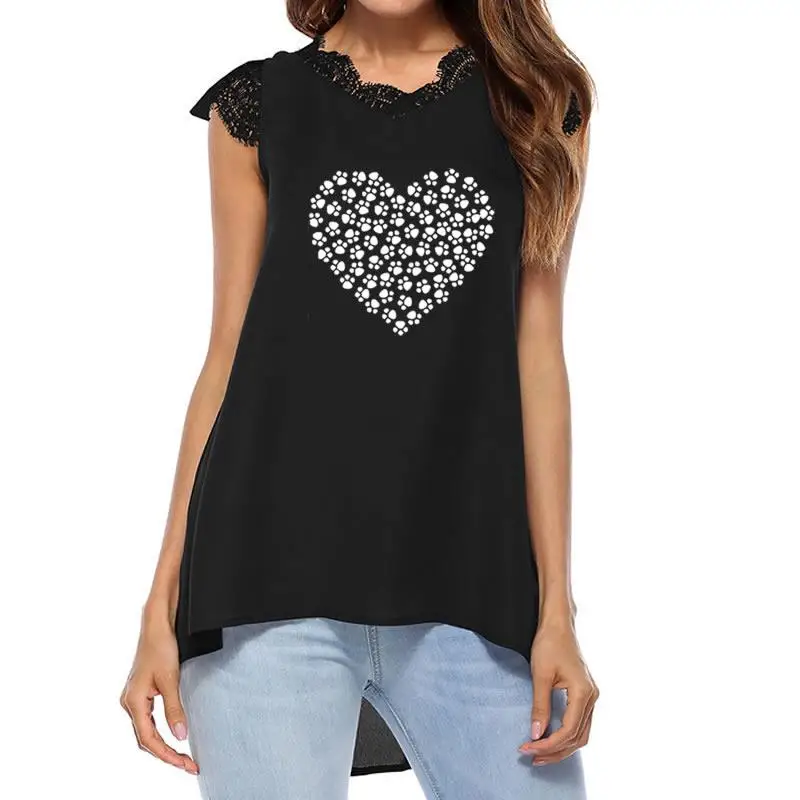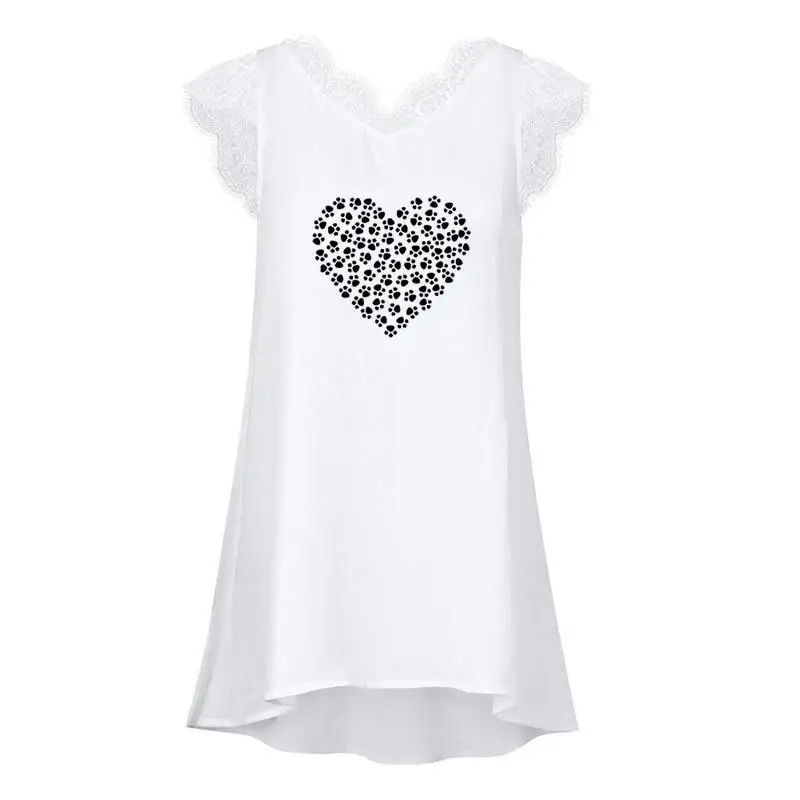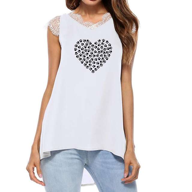 Fashion Dog Cat Paw Heart Cute Harajuku T-Shirt Women Plus Size Lace Stitching Top Ladies Sleeveless Chiffon Tops Summer