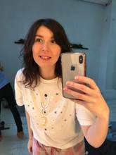 Pretty interesting T-shirt. I took a larger size that would not fit tightly, it was short. Everything is very neatly sewn. Thank you for the gift.