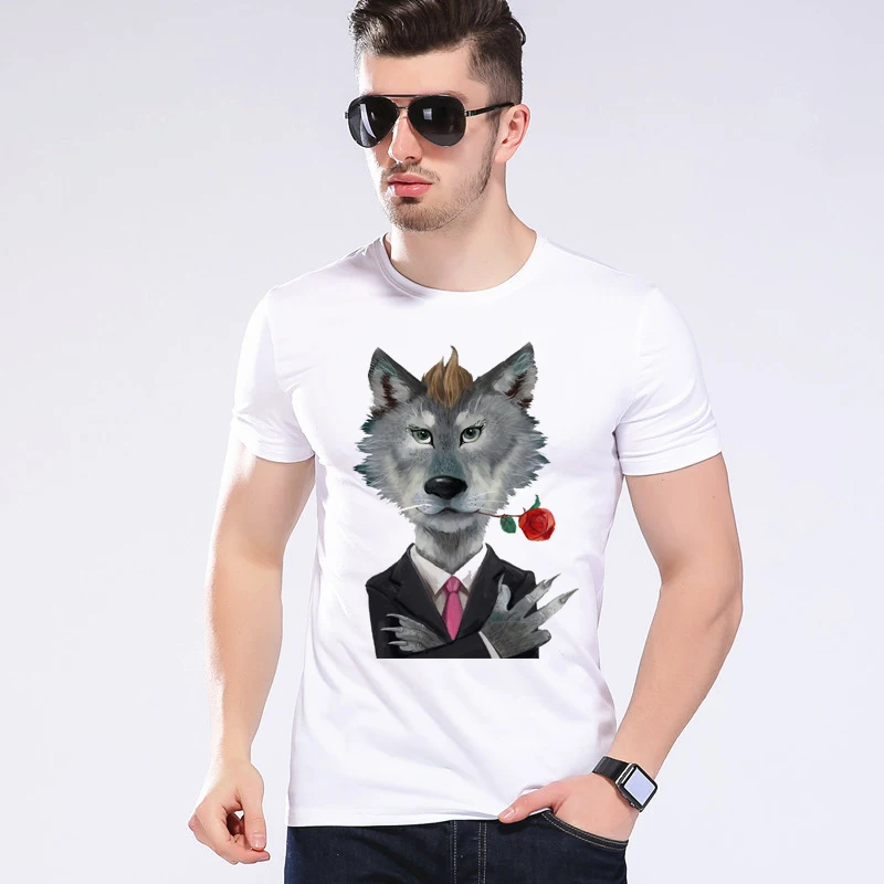 Gentleman Wolf With Roses Printed Men T-shirt 2019 New Cartoon 3D funny animals T Shirt Camisetas Hombre Moe Cerf 2D-1#