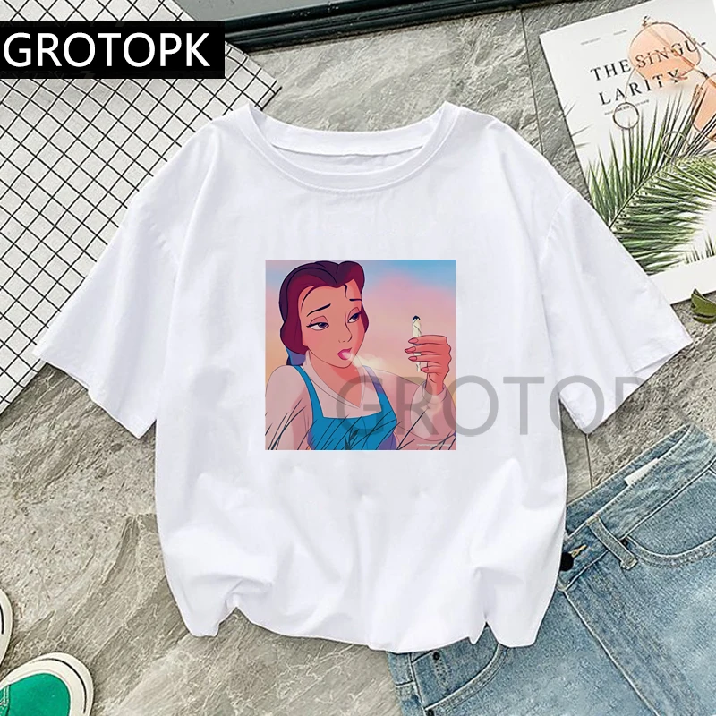 GROTOPK Funny Ladies Harajuku T Shirt Smoking Belle Cotton O-Neck Punk Spoof T-Shirt Print Casual Short Sleeve Women Tshirt