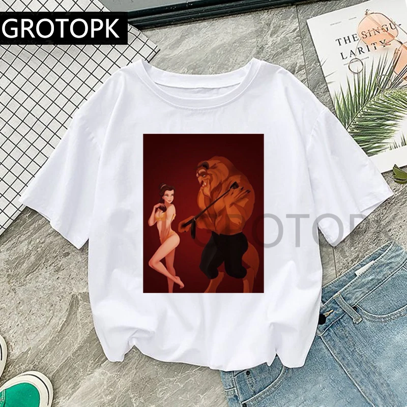 GROTOPK Vintage Beauty&The Beast Spoof T Shirt Cotton O-Neck Print Casual Short Sleeve Harajuku Women’s T-Shirt Plus Size Tops