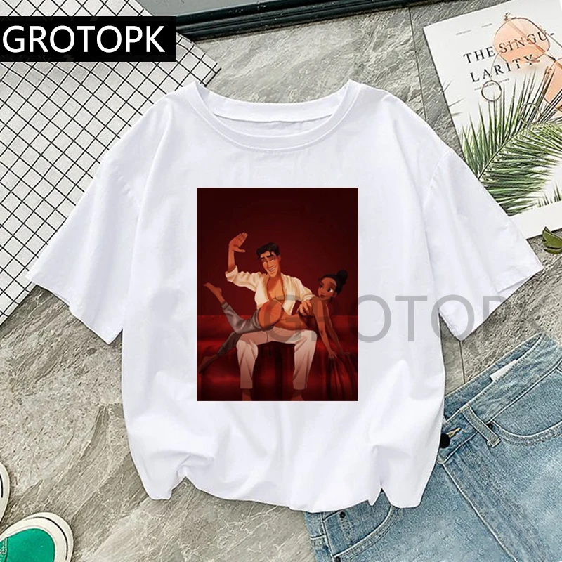 GROTOPK Vintage The Princess&Frog Spoof T Shirt Cotton O-Neck Print Casual Short Sleeve Harajuku Women’s T-Shirt Plus Size Tops