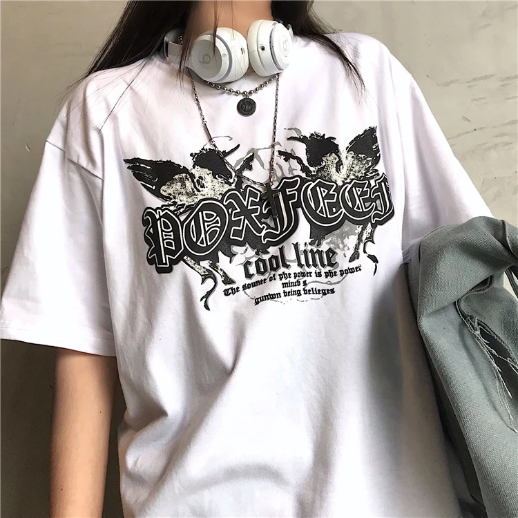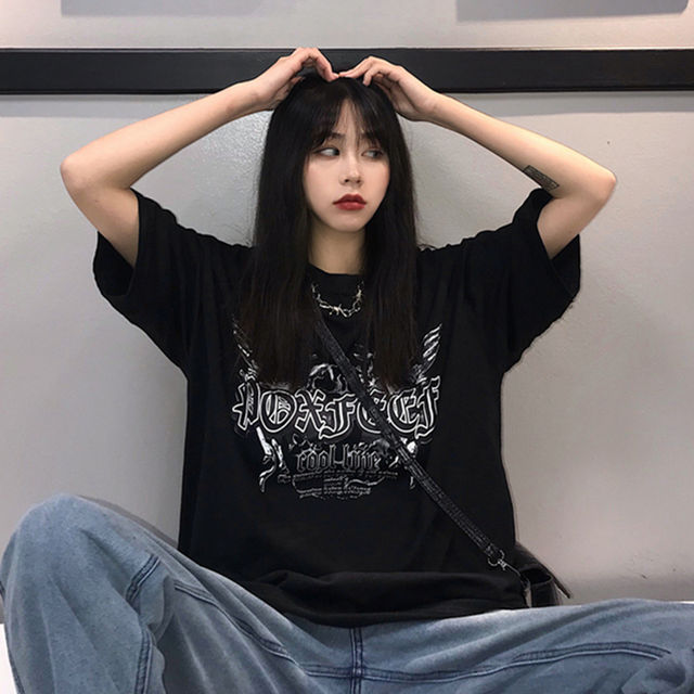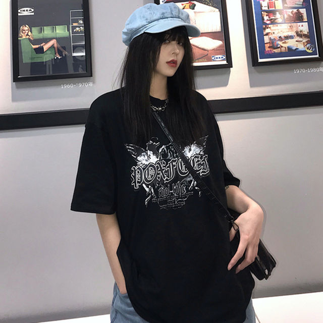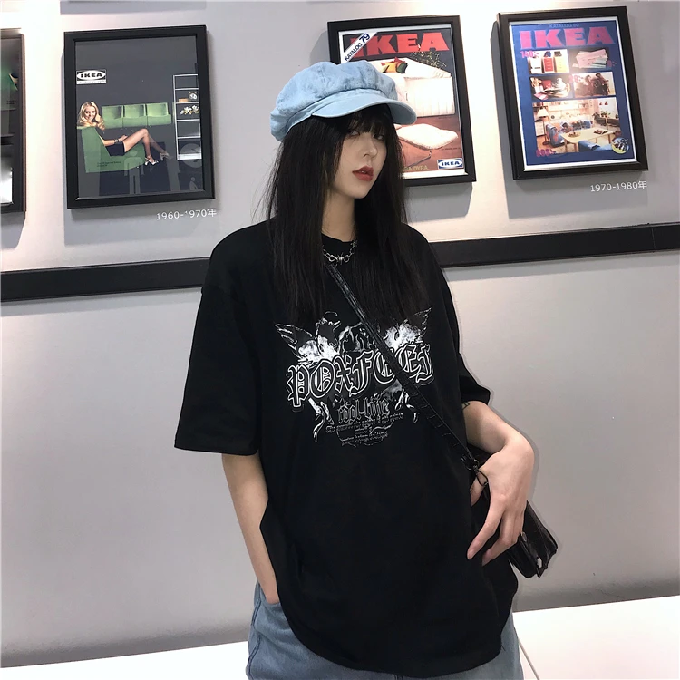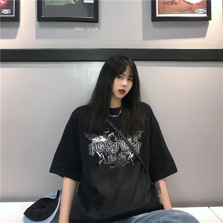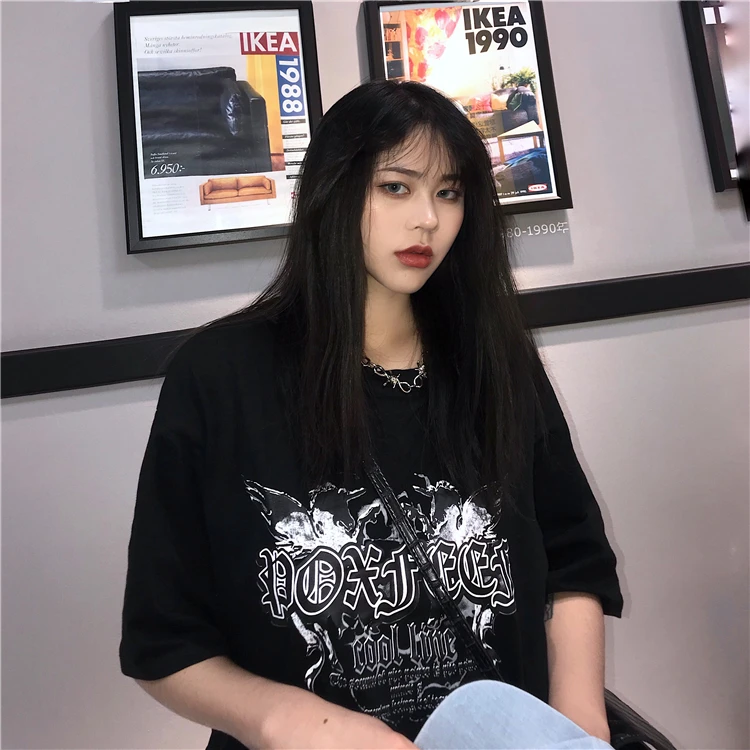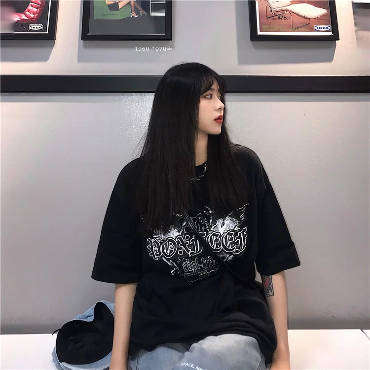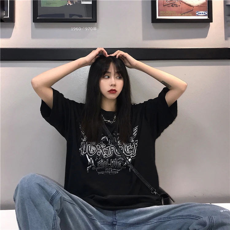 Harajuku Retro dark Sanskrit letters print Cotton short-sleeve tops Ulzzang bf loose fashion oversized ins casual women T-shirt