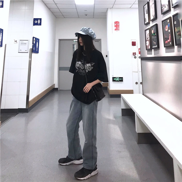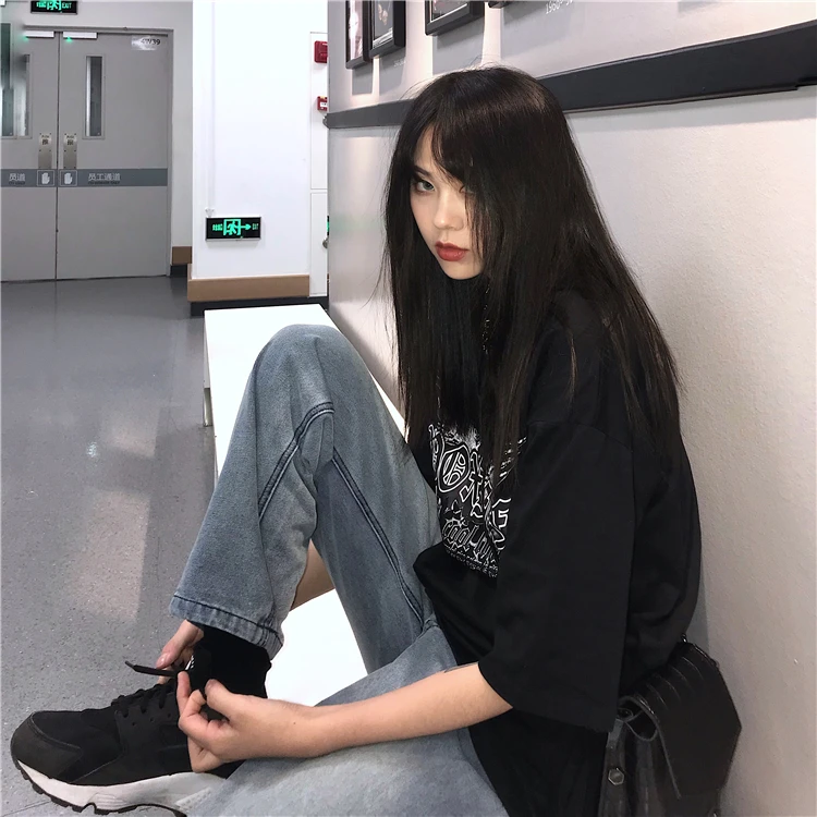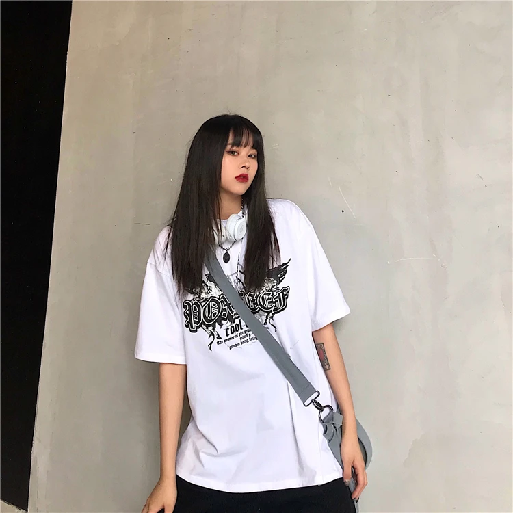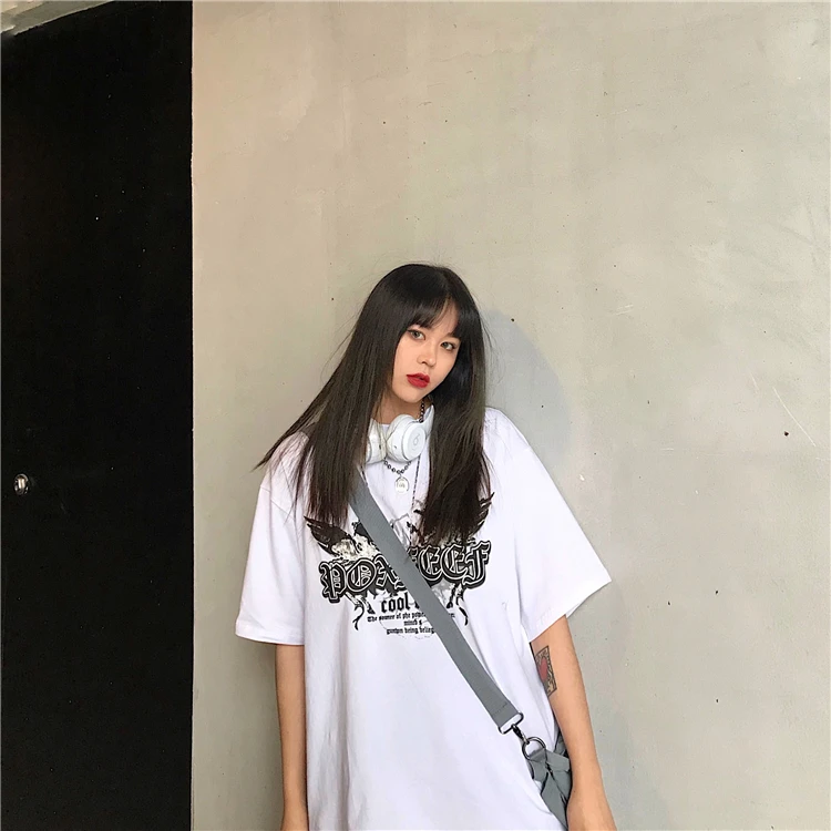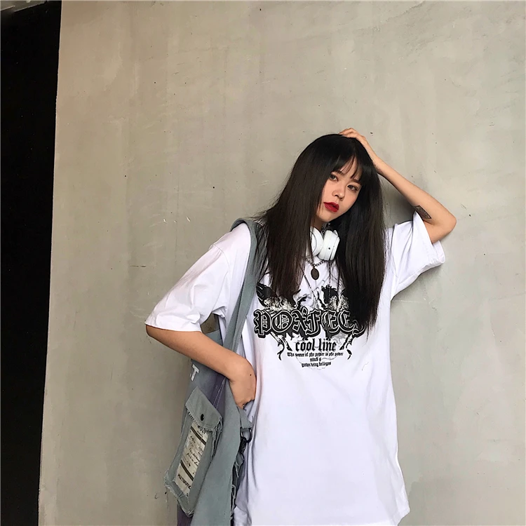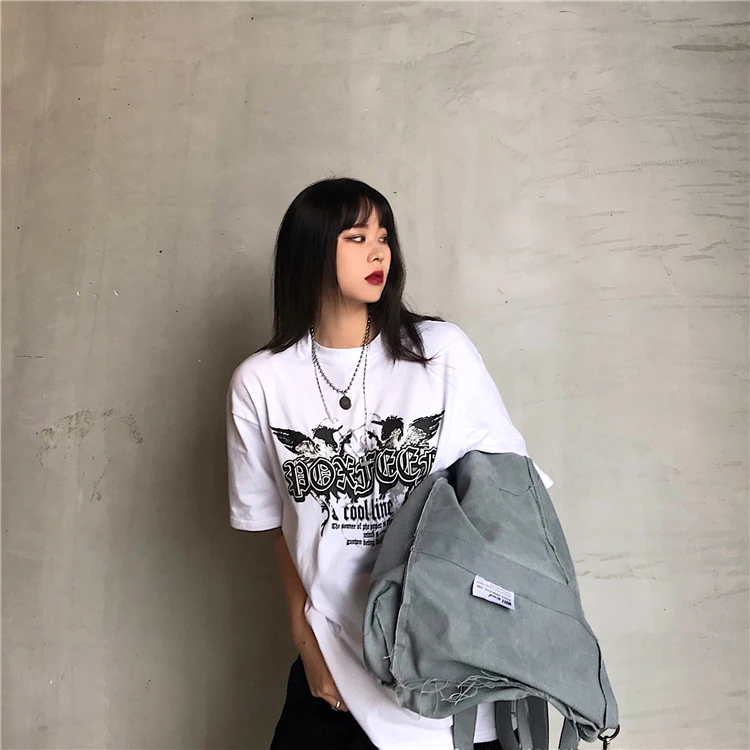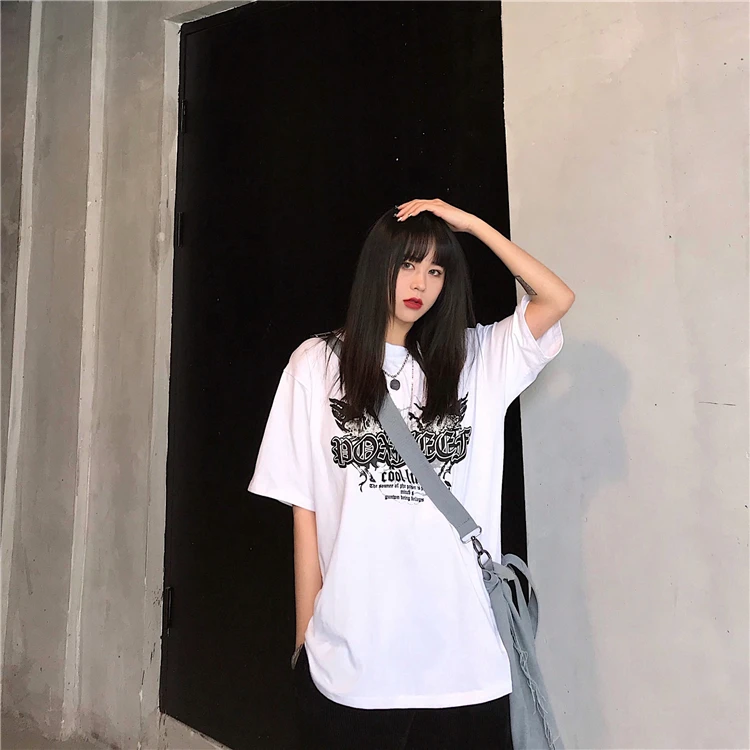 Harajuku Retro dark Sanskrit letters print Cotton short-sleeve tops Ulzzang bf loose fashion oversized ins casual women T-shirt