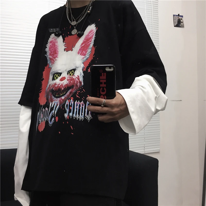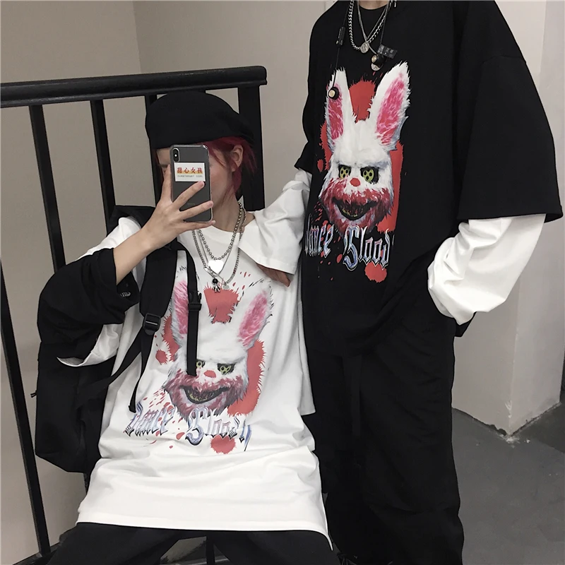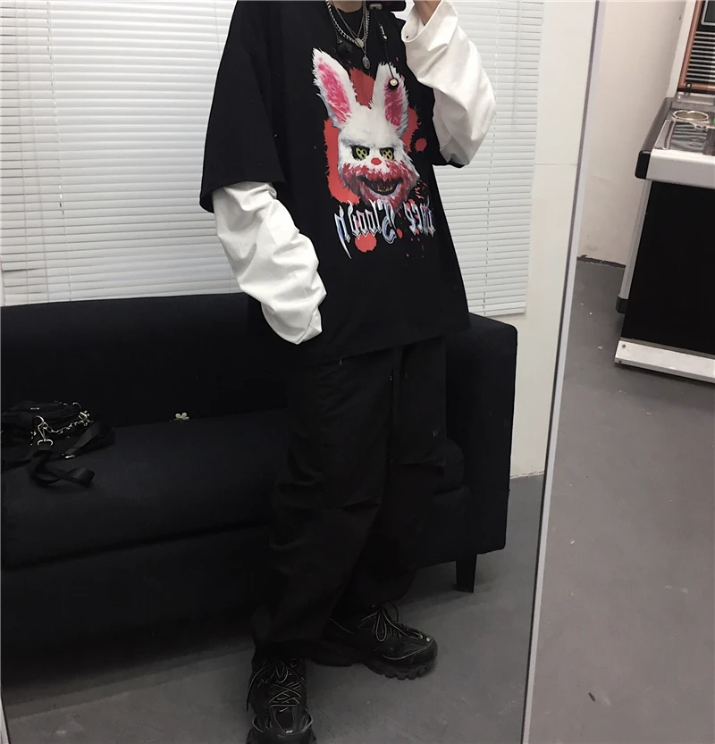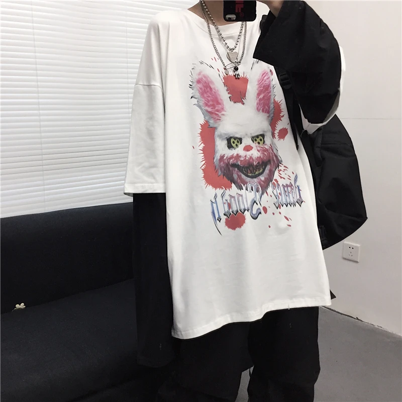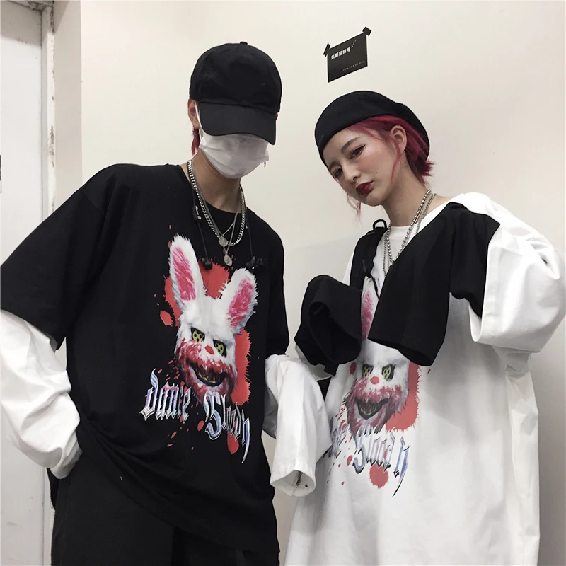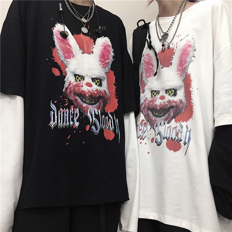 Japan personality bloody dark bf unisex Tops Tees Harajuku casual loose cartoon rabbit print long sleeve fake two women T-shirt