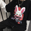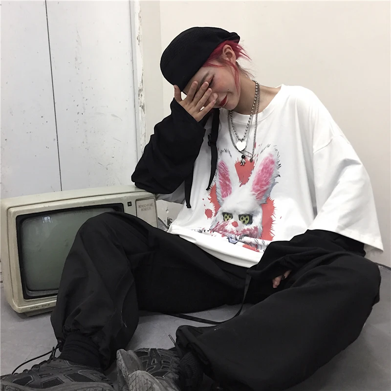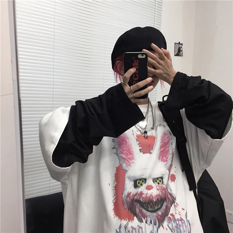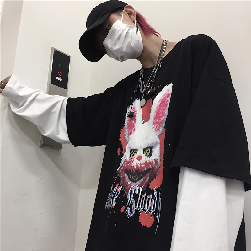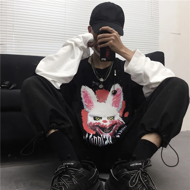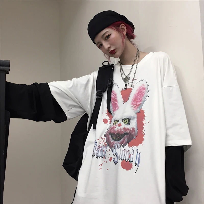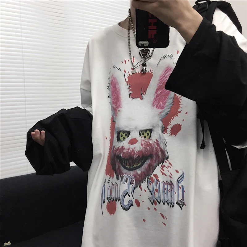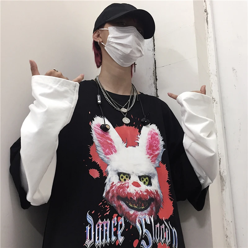 Japan personality bloody dark bf unisex Tops Tees Harajuku casual loose cartoon rabbit print long sleeve fake two women T-shirt
