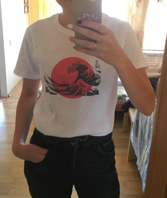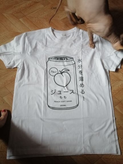 Wonderful T-shirt. The print is beautiful. Cotton, the size matches. Delivery month and a half
