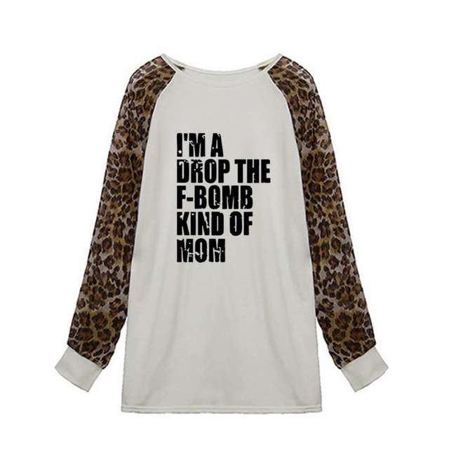 New Arrival T-Shirt for Women F-BOMB MOM Letters Print Leopard Print Long Sleeve T-Shirt Tshirt Women Off The Shoulder Tops