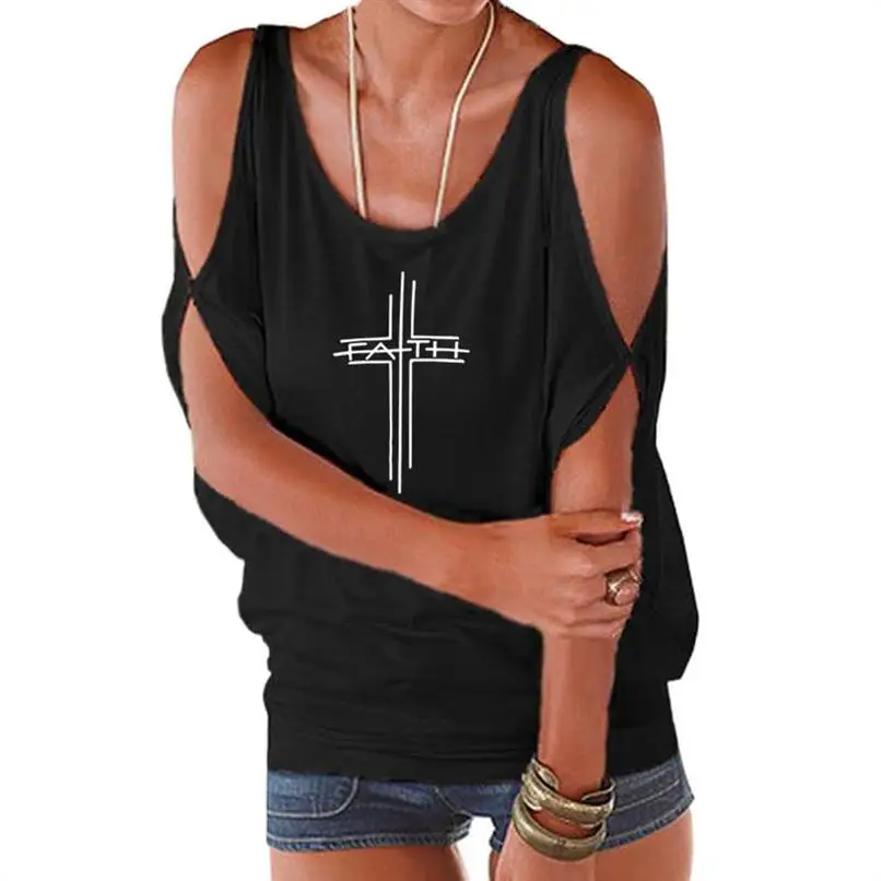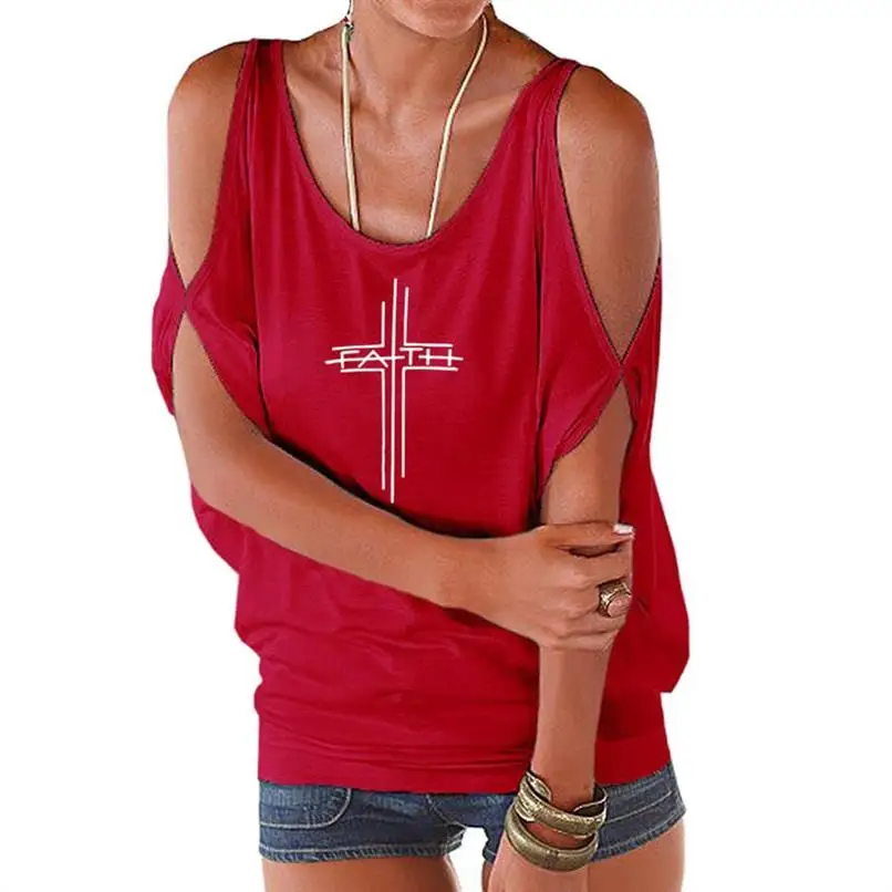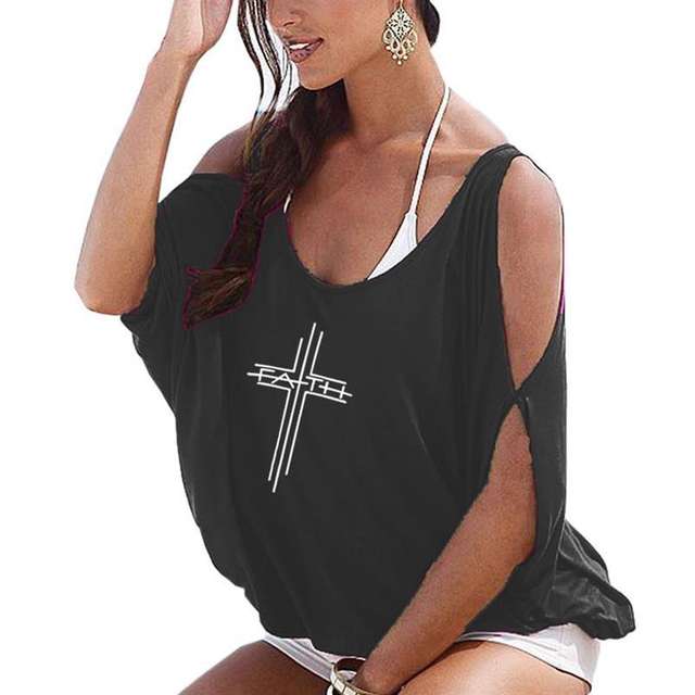 New Fashion Faith Geometric Print T-Shirt for Women Off The Shoulder Bat Sleeve Women T-Shirt Female Plus Size Summer Top Femme