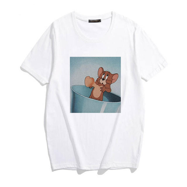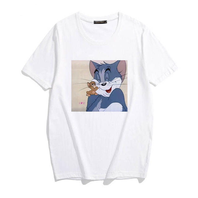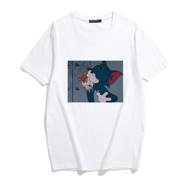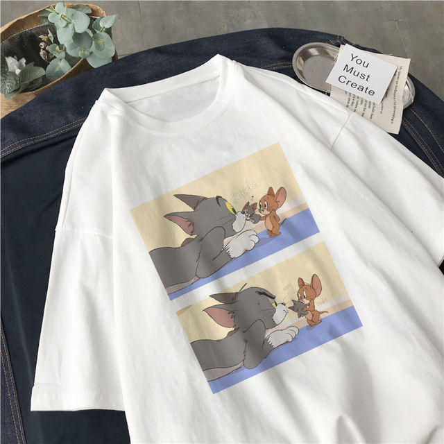 New Funny Cute Cartoon Summer tops tees Harajuku Ulzzang Tom Cat and Jerry Mouse Print Casual Loose Short Sleeve women T-Shirt