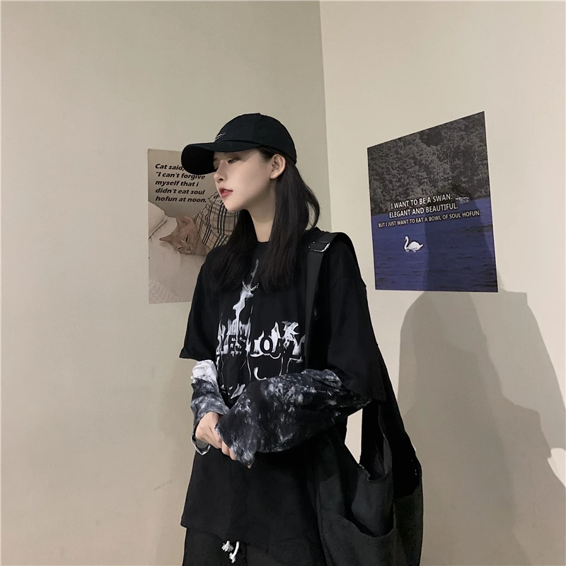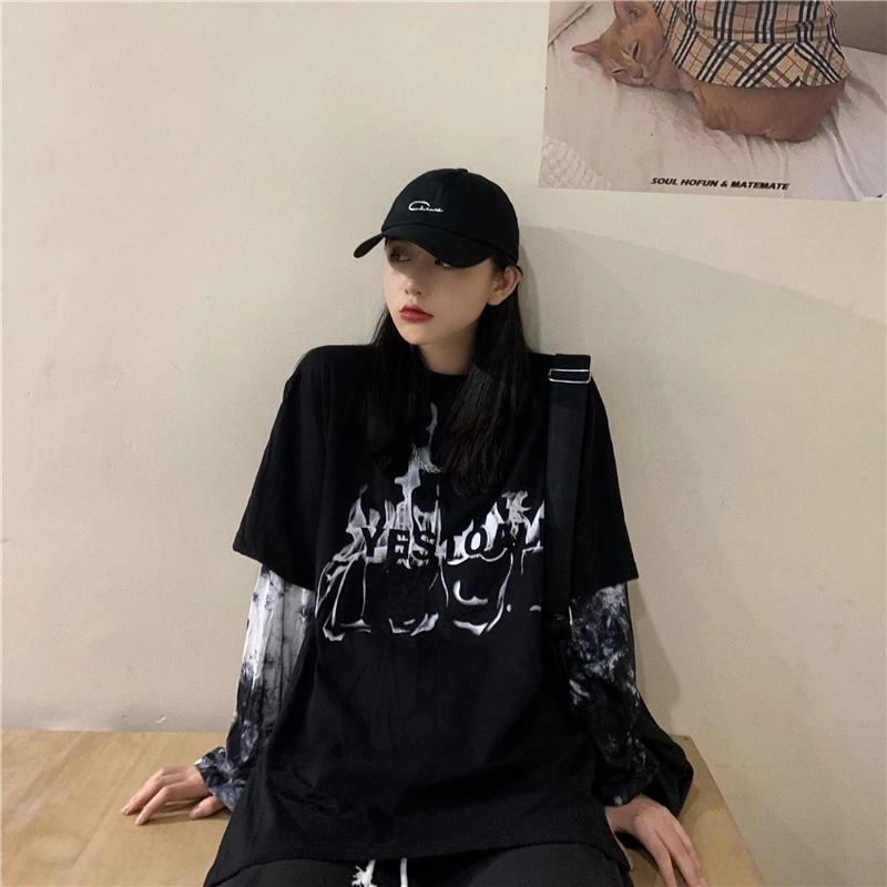 New Hiphop fake two tie-dyed casual loose long-sleeve women tops tees oversized Ulzzang Harajuku Japan streetwear unisex T-shirt