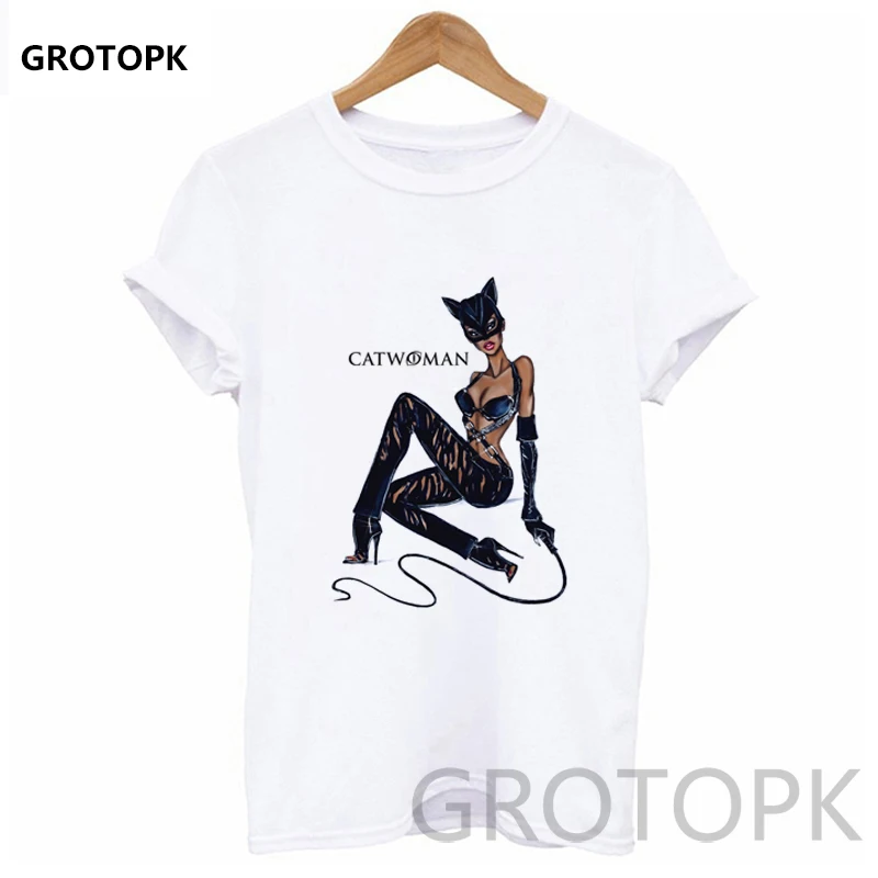 New Summer 2019 Catwoman Sexy Black Leather Lady Print T-shirts for Women Cotton White T Shirt Female Clothes Harajuku Tees Tops