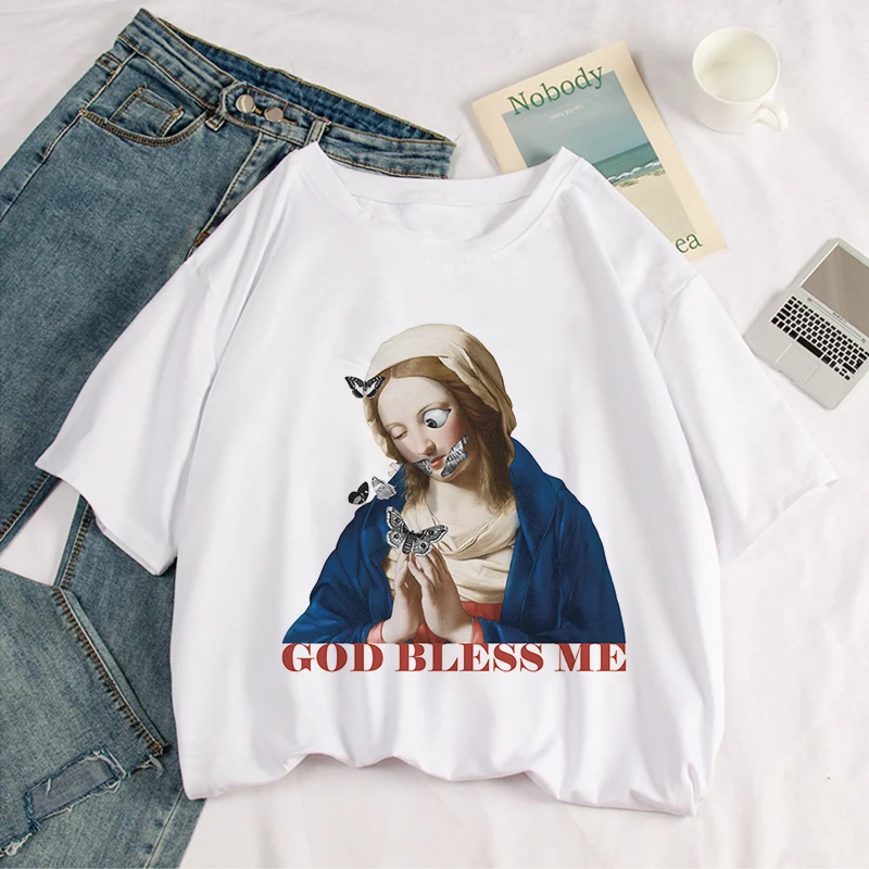 New Summer Spoof funny women’s GOD BLESS ME Faith vintage printing tops Harajuku fashion casual loose large size women’s T-shirt