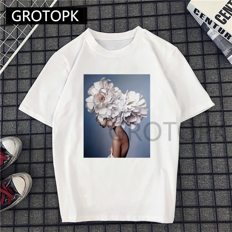 Retro-aesthetic Lady and Flower Print T-shirt Women Cotton White Harajuku Tops Streetwear Short Sleeve Tee Shirt Korean Clothes