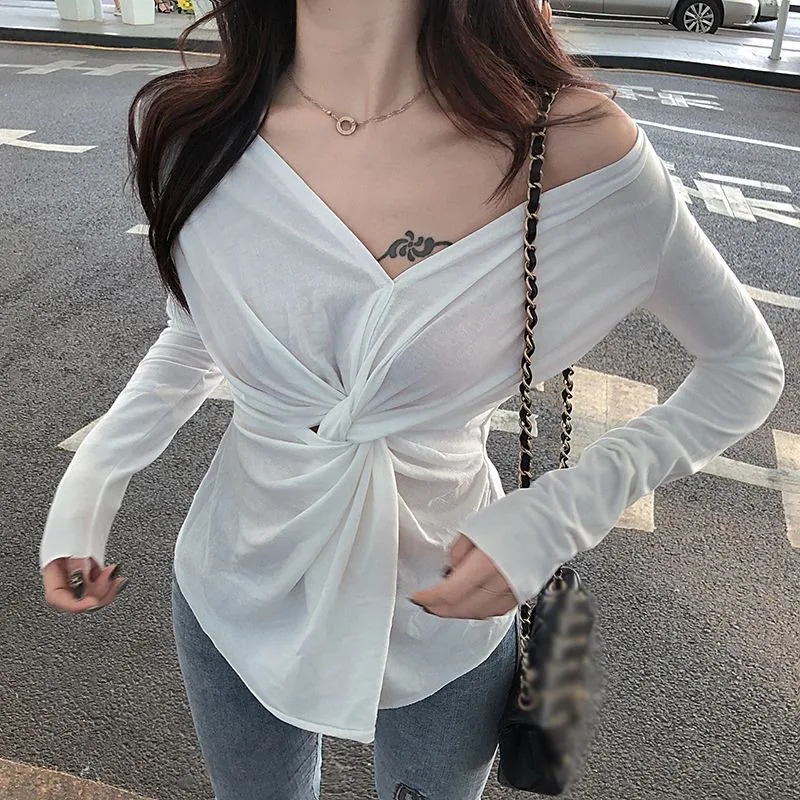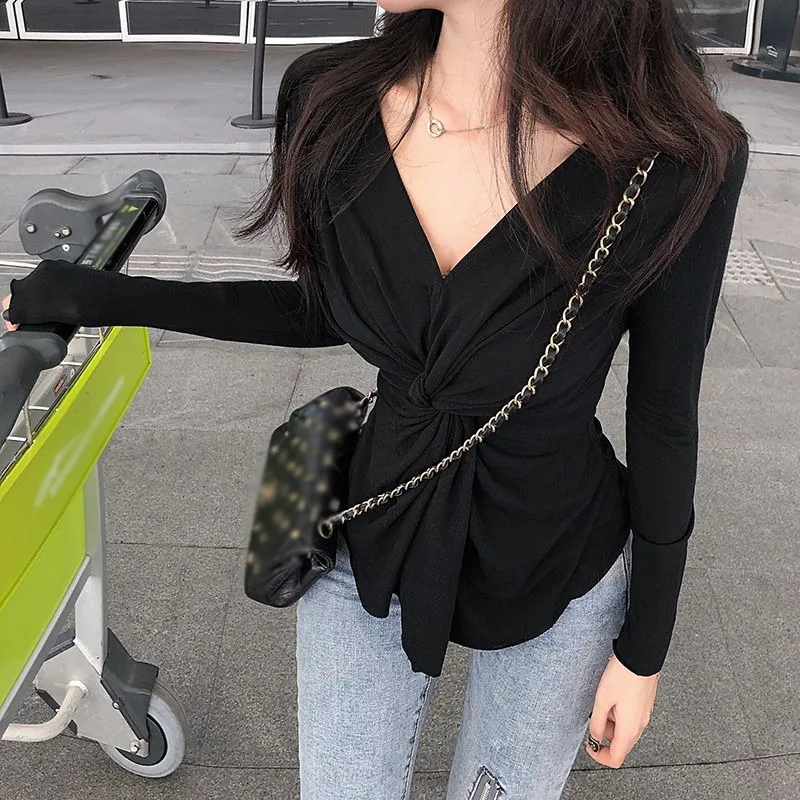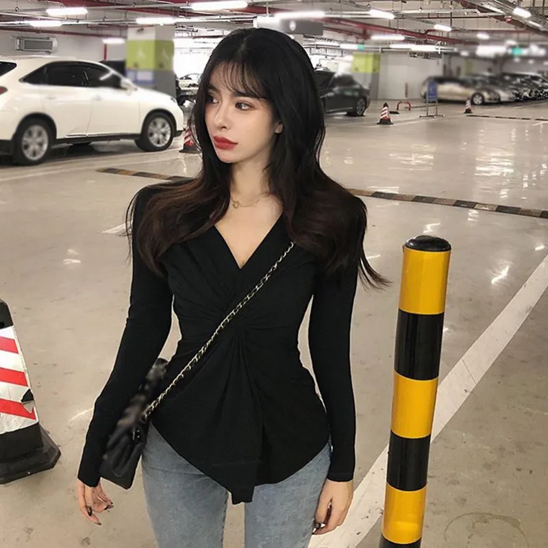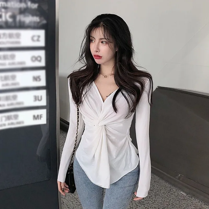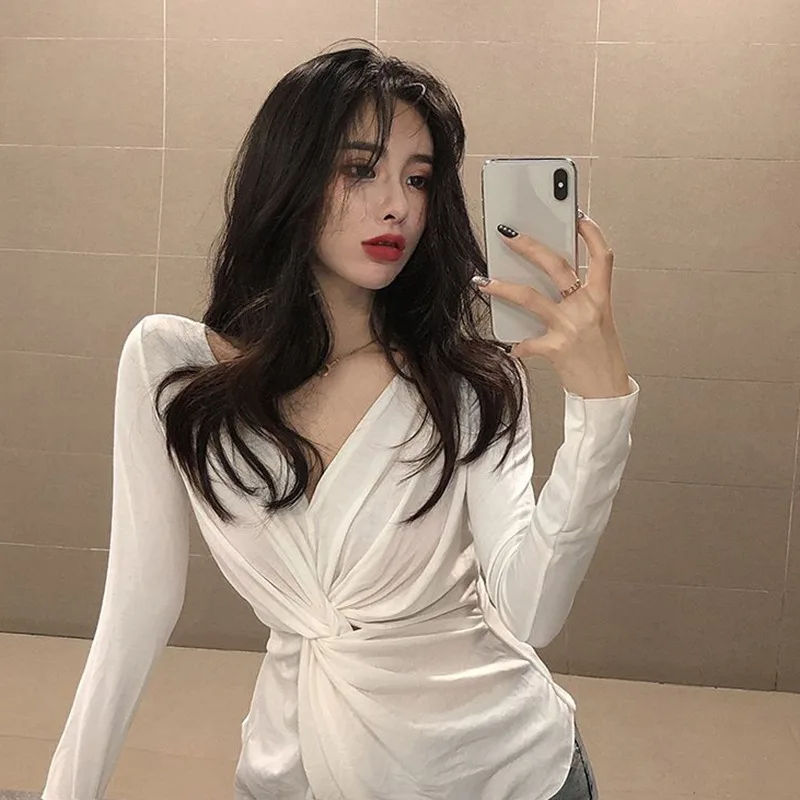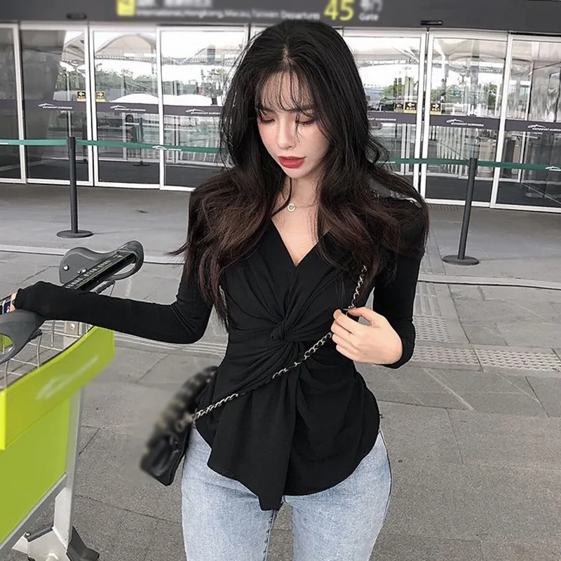 Sexy Slim Women T-Shirt New Autumn Fashion V-Neck Tops Solid Color Loose Long Sleeve Casual Simple T-Shirt Tops Black White