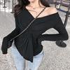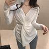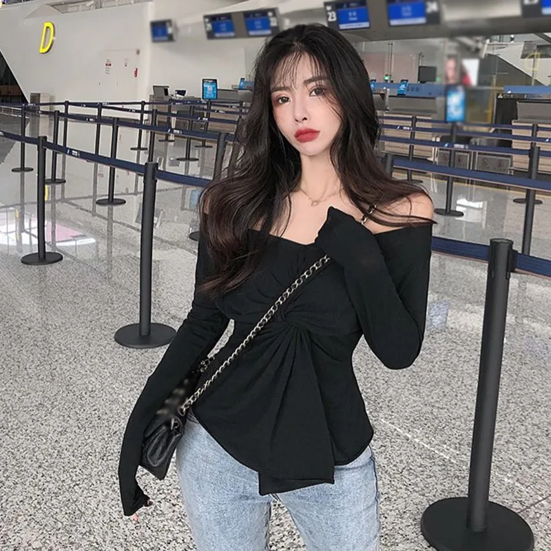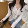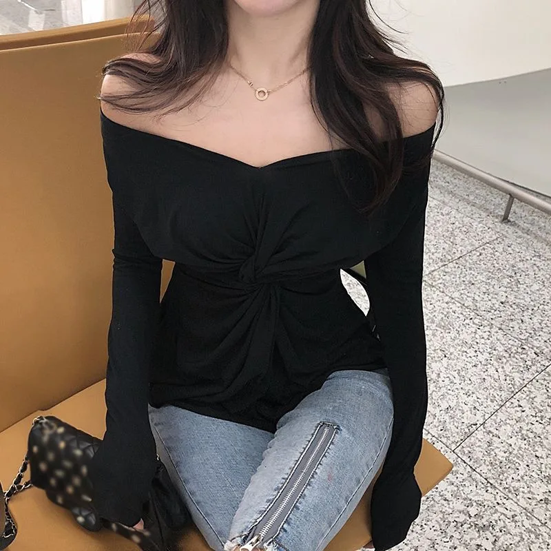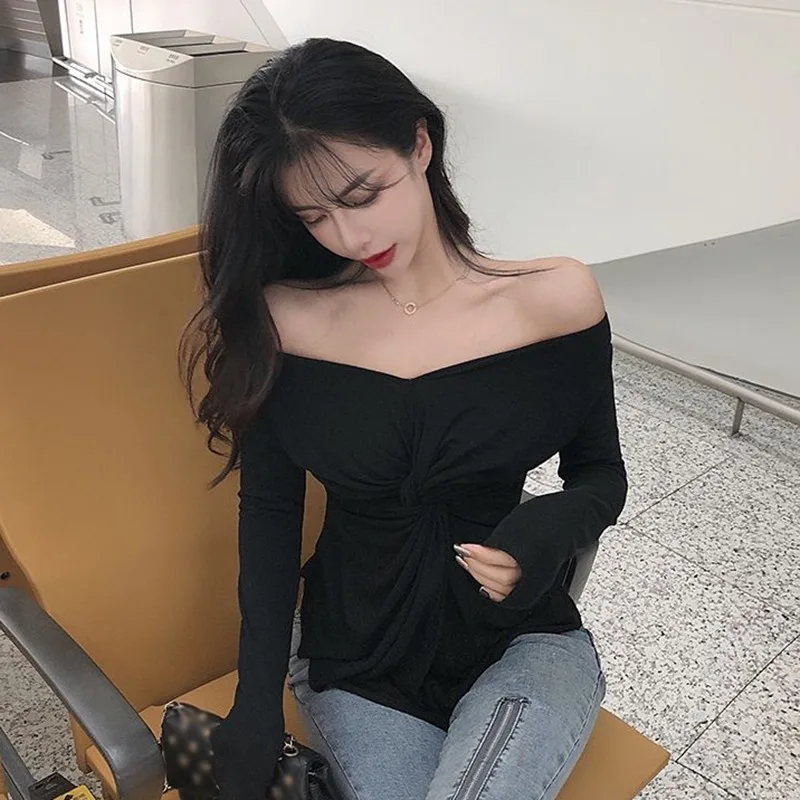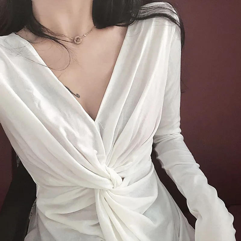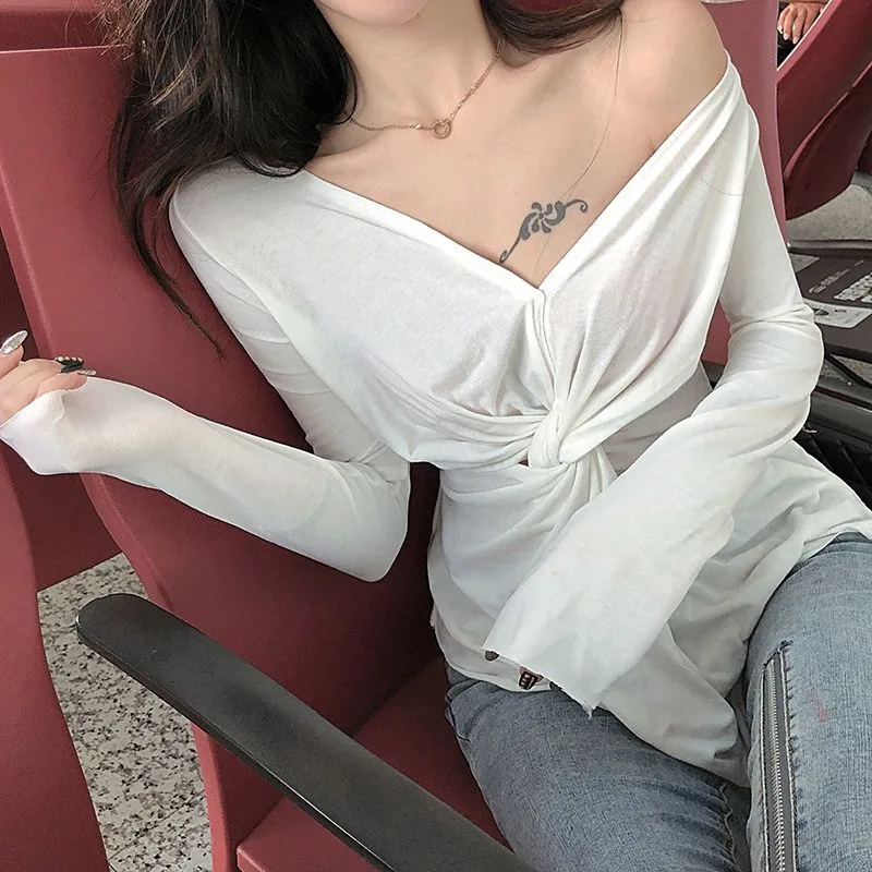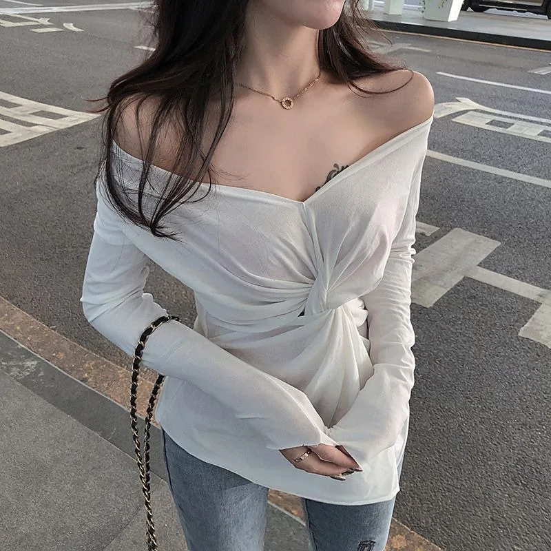 Sexy Slim Women T-Shirt New Autumn Fashion V-Neck Tops Solid Color Loose Long Sleeve Casual Simple T-Shirt Tops Black White