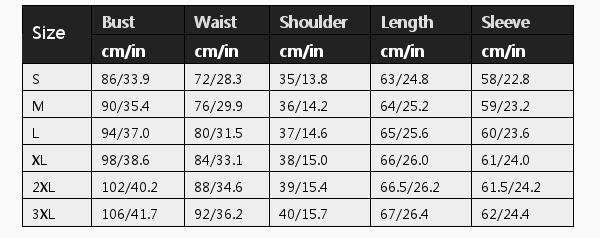 | Size: | XL | Bust(cm/in): | 98/38.6 | Waist(cm/in): | 84/33.1 | Shoulder(cm/in): | 38/15 | Length(cm/in): | 66/26 | Sleeve(cm/in): | 61/24 |