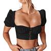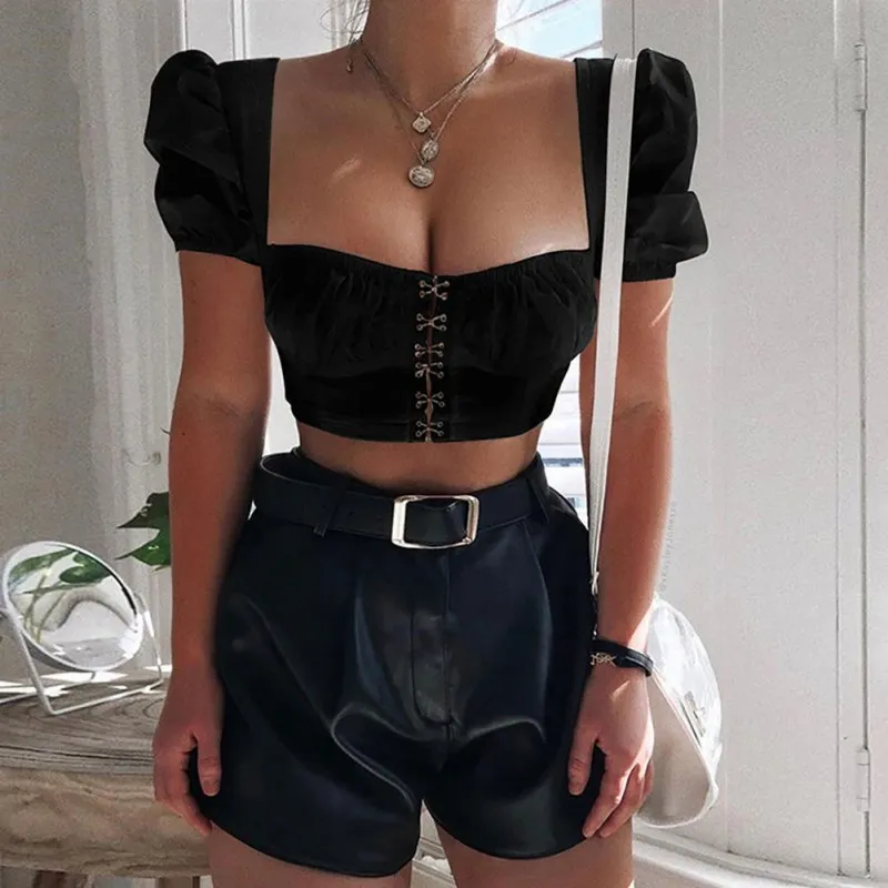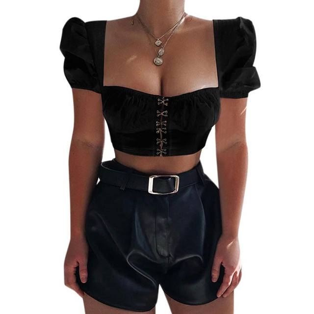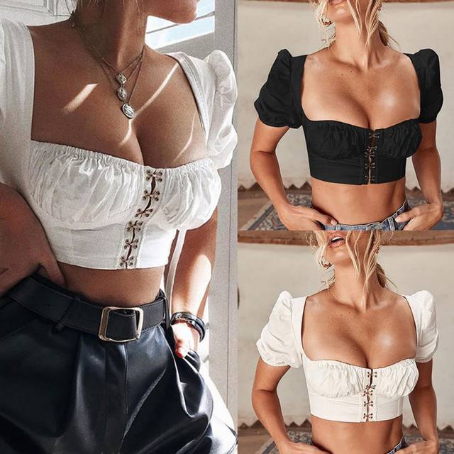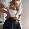 Sexy Women T Shirt Low Neck Slim Wrinkled Short Sleeve Expose Navel Backless Elastic Tight-fit Casual Bottoming Lace Up Tee Tops