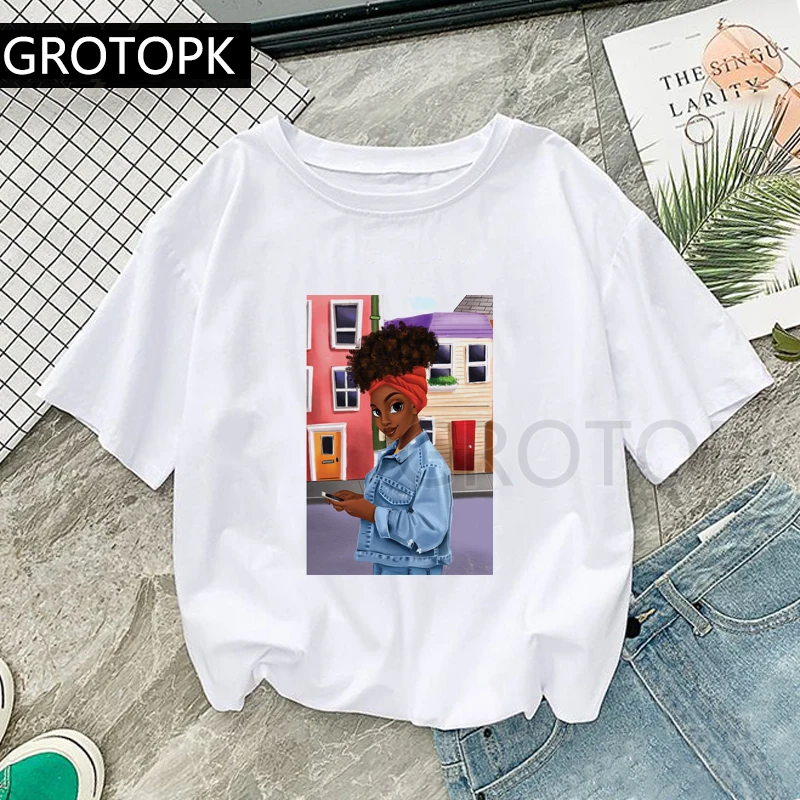 Summer Casual Female Short Sleeve Art Print Female Tops Black Girl Home Fashion Harajuku T-Shirt Melanin Poppin