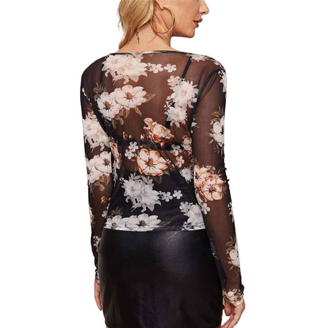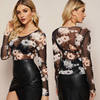 Summer Mesh Sheer Floral T-shirt Women Sexy Club Fashion Ladies See-through Long Sleeve Tops