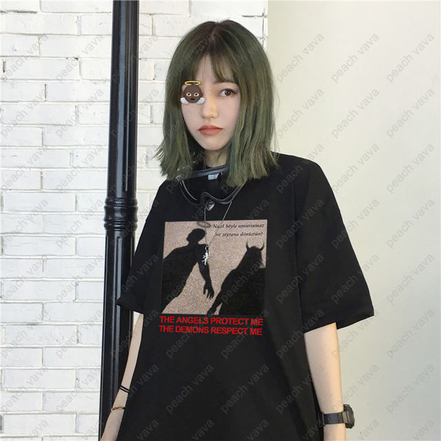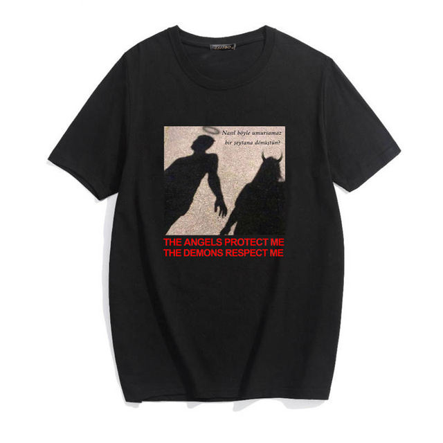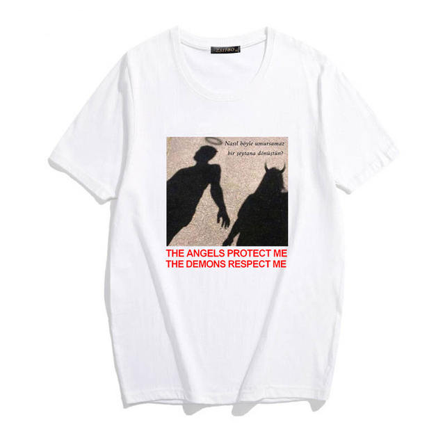 THE ANGELS PROTECT ME THE DEMONS RESPECT ME print Tees Harajuku Summer chic vintage BF large size loose tops women’s T-shirt