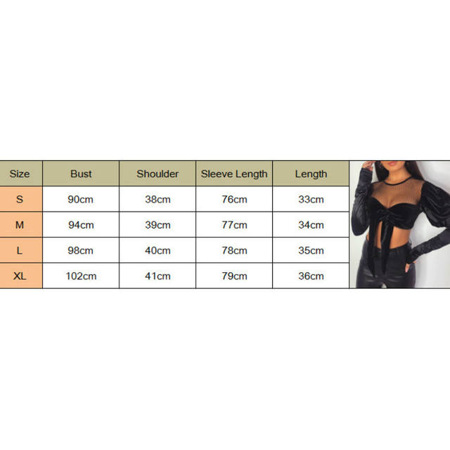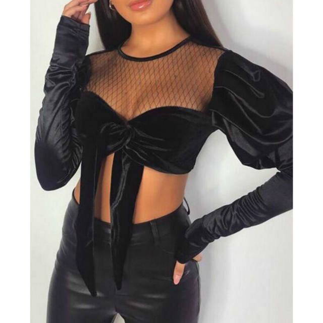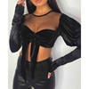 Women Puff Sleeve Mesh Lace-up Cropped Tops Crew Neck Pullover Black Blouse Shirts Cropped Tee