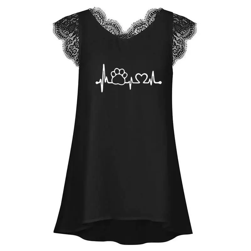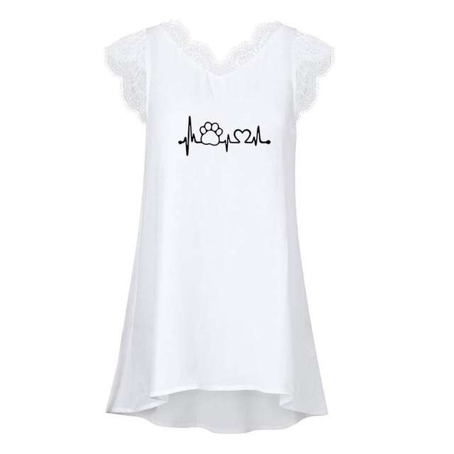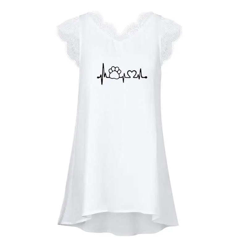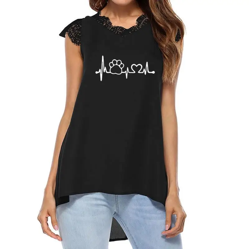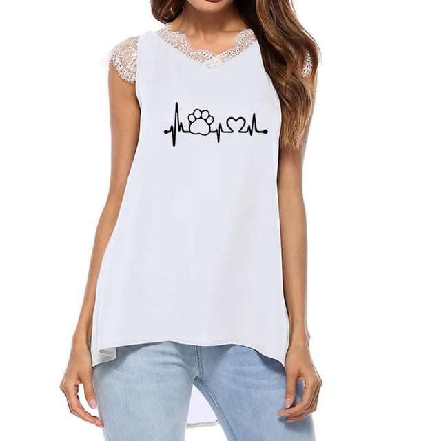 Women T-shirt Fashion Dog Cat Paw Heart Cute 2018 New Summer Kawaii Lace Stitching Top Ladies Sleeveless Chiffon Plus Size