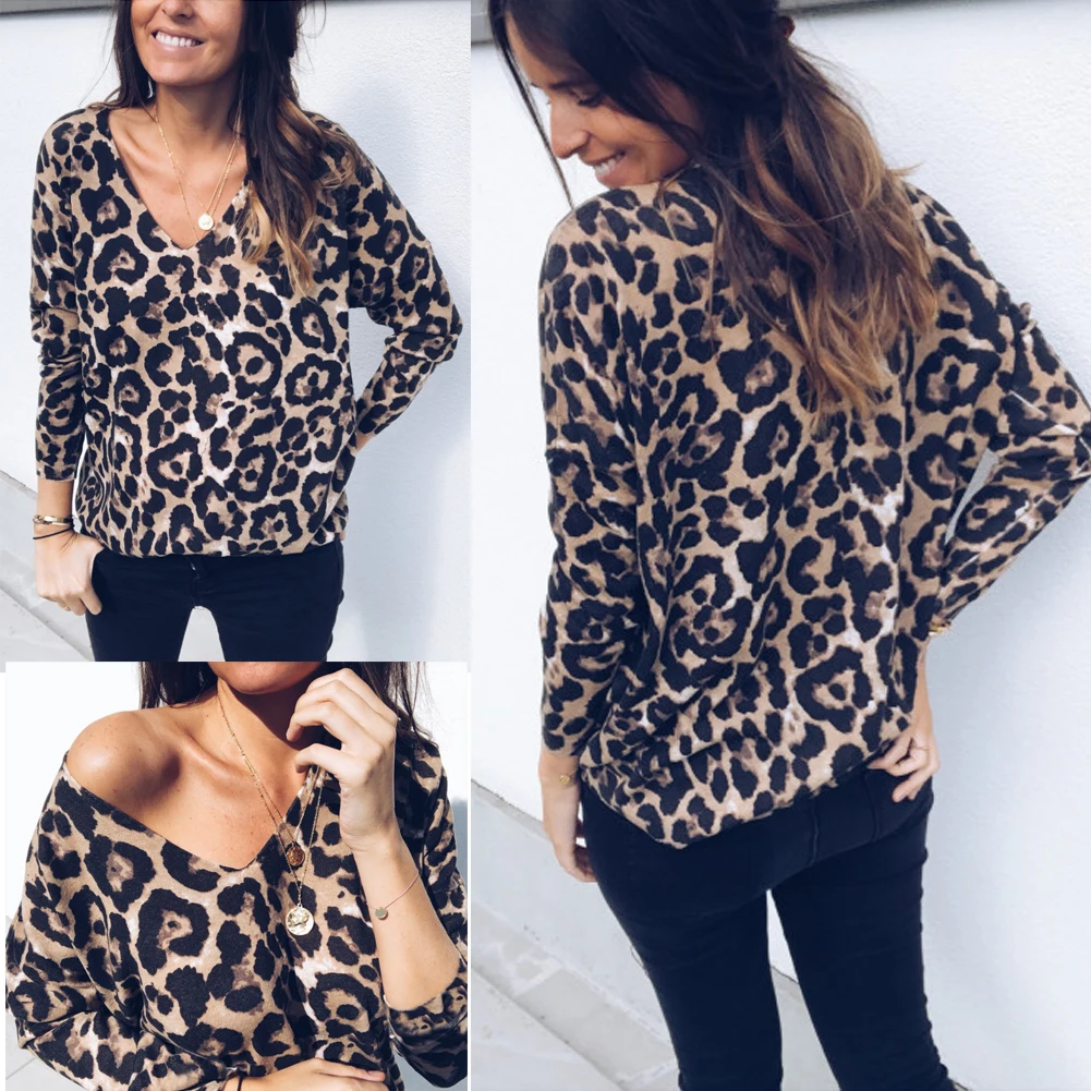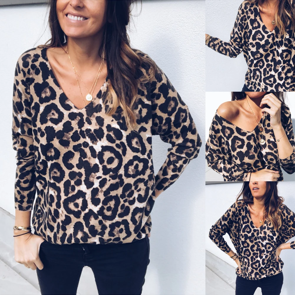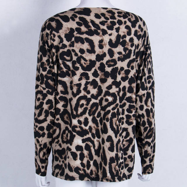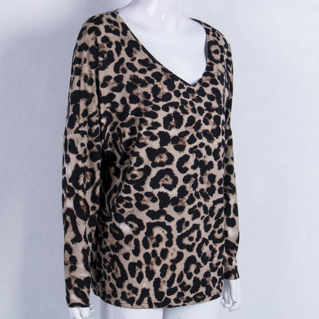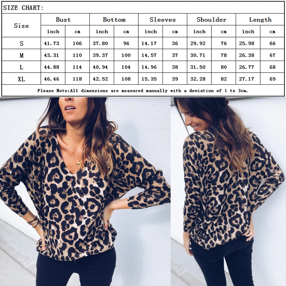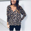 Women V Neck Vintage Leopard Prin T-shirt Long Sleeve Pullover Casual Spring Autumn Tops T-shirt